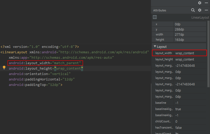 그런데 ``ViewBinding``을 사용하면 레이아웃이 약간 틀어지는 문제가 있다. 대표적으로 ``layout_width`` 혹은 ``layout_height``가 ``wrap_content``로 고정되는 문제. 분명히 ``match_parent``로 설정했음에도 불구하고 Layout Inspector로 보면 ``wrap_content``로 설정되어 있다.