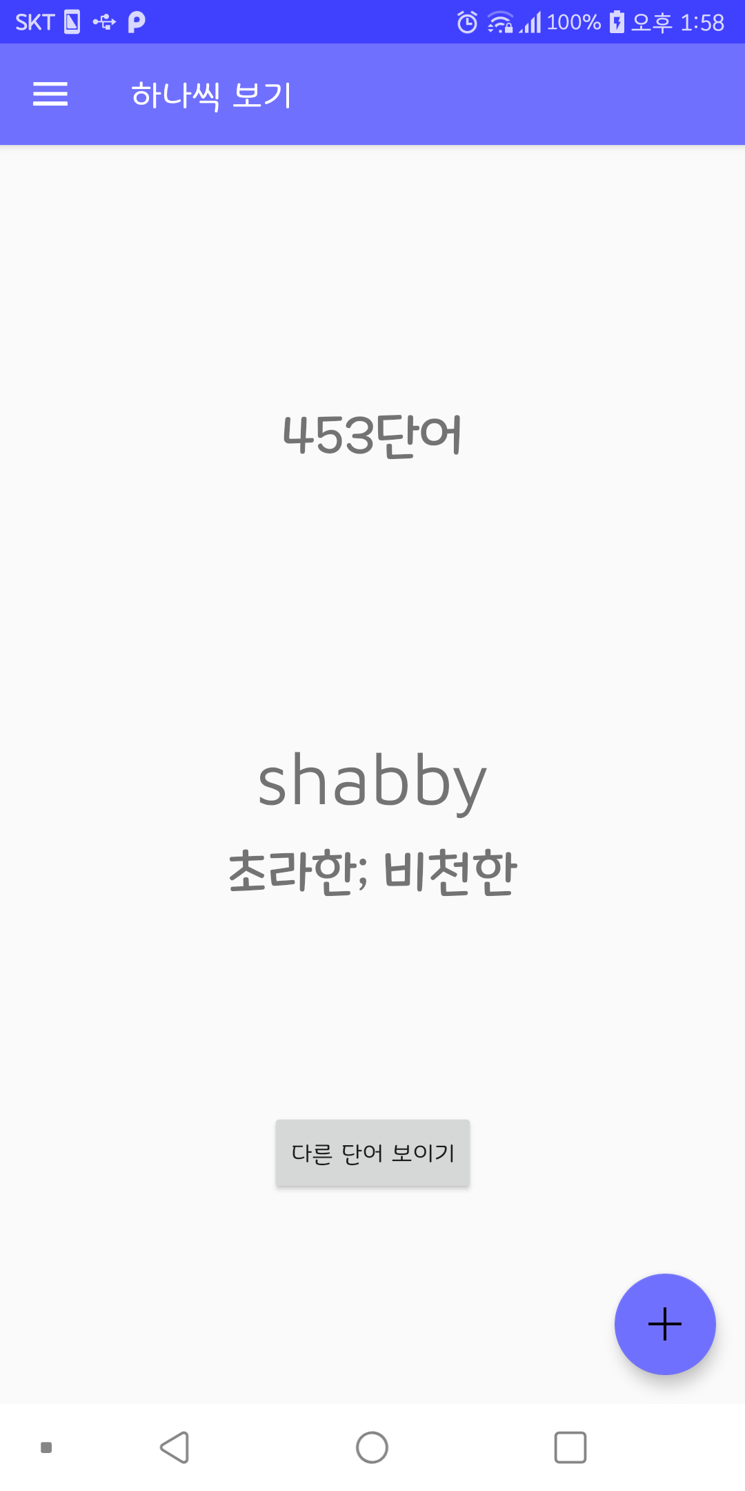 겨울방학 때 토플 공부하려고 만든 앱이다. 위젯에 상단바 알림까지 구현해 놨는데, 더 추가할 게 생각이 안 나서 일단은 개발 중단 상태. 워낙 간단한 앱이라 이슈도 딱히 없다.