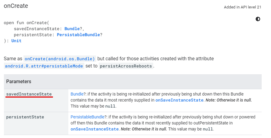 액티비티가 종료된 후 다시 초기화될 때, 이전 액티비티의 데이터가 ``savedInstanceState``에 저장되어 주어진다. 물론 액티비티가 처음 실행되는 경우에는 ``null``이다. 앱이 완전히 종료된 후 다시 실행되는 경우에도 ``null``이다.