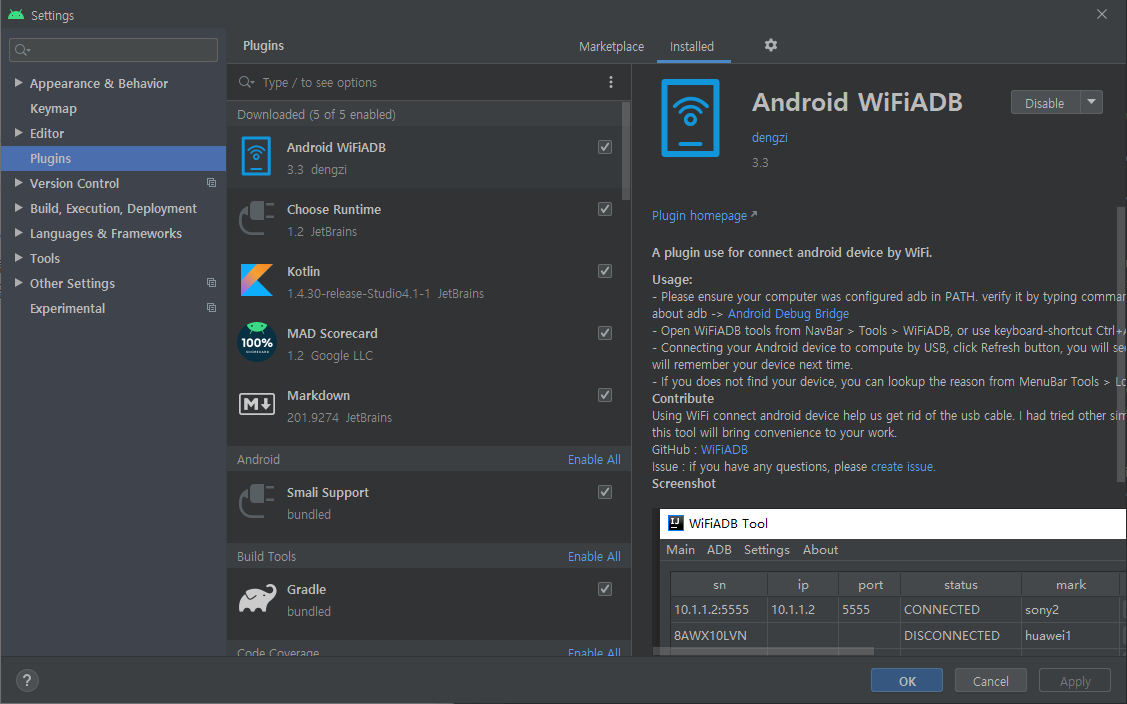 File > Settings > Plugins에서 Android WiFiADB를 검색하고 설치한다. 참고로 설치수가 가장 많은 플러그인은 작동하지 않는다. IntelliJ에서만 사용 가능하다고 하는데 애초에 IntelliJ에서 adb를 쓸 일이 있나?