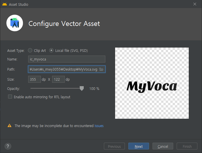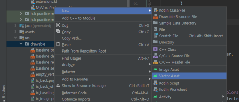 res/drawable에서 오른쪽 버튼을 눌러 New - Vector Asset을 선택한다.