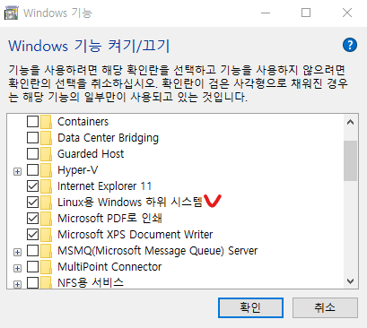 Linux용 Windows 하위 시스템을 체크하고 확인을 눌러줍니다. 재부팅이 필요할 수도 있으니 주의하세요.