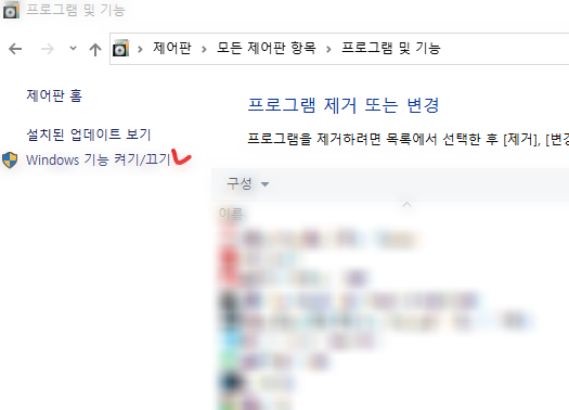 설치하기 전에, 우선 제어판에서 WSL 기능을 활성화해야 합니다. 제어판→프로그램 및 기능에서 왼쪽의 Windows 기능 켜기/끄기를 클릭합시다.
