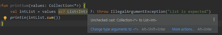 이 코드는 정상적으로 컴파일된다. ``values``에 ``List<Int>``를 전달하면 정상적으로 동작하지만, ``Set<Int>``를 전달하면 ``IllegalArgumentException``이 발생하고, ``List<String>``을 전달하면 sum을 계산하는 과정에서 ``ClassCastException``이 발생한다. ``String``을 ``Int``로 사용하려 했기 때문이다.