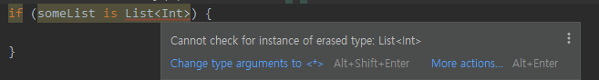 제네릭 클래스도 ``as``와 ``as?``를 이용하여 형변환할 수 있다. ``List``를 ``Set``으로 형변환하면 당연히 exception이 발생한다. 그런데 ``List<Int>``를 ``List<String>``으로 형변환하면 에러가 발생하지 않는다. 애초에 타입을 모르기 때문이다. 대신 나중에 리스트의 요소인 ``Int``를 ``String``으로 간주하여 사용할 때 exception이 발생한다.