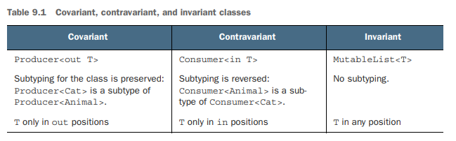 다시 처음의 ``List``와 ``MutableList`` 얘기로 돌아가자. ``List``는 ``T``를 out-position으로만 사용한다. 반면 ``MutableList``에는 ``T``를 매개변수로 받는 in-position 함수가 존재한다(``append`` 등). 이런 이유 때문에 ``List``의 타입 매개변수는 ``out``을 선언되고, ``MutableList``는 그렇지 않은 것이다.