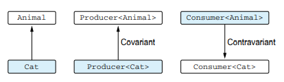 ``Cat``의 생산자는 ``Animal``의 생산자로 여겨질 수 있다. 따라서 ``Producer<Cat>``은 ``Producer<Animal>``의 서브 타입이다. 반대로 ``Animal``의 소비자는 ``Cat``의 소비자로 여겨질 수 없다. ``Cat``의 소비자가 더 구체적인 소비자이기 때문이다. 따라서 ``Consumer<Cat>``이 ``Consumer<Animal>``의 상위 타입이다.