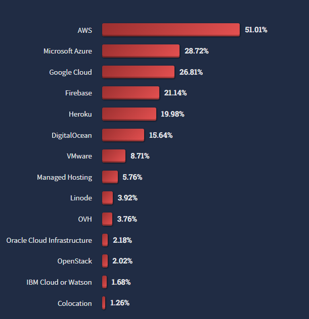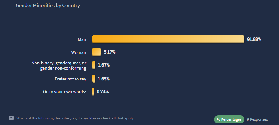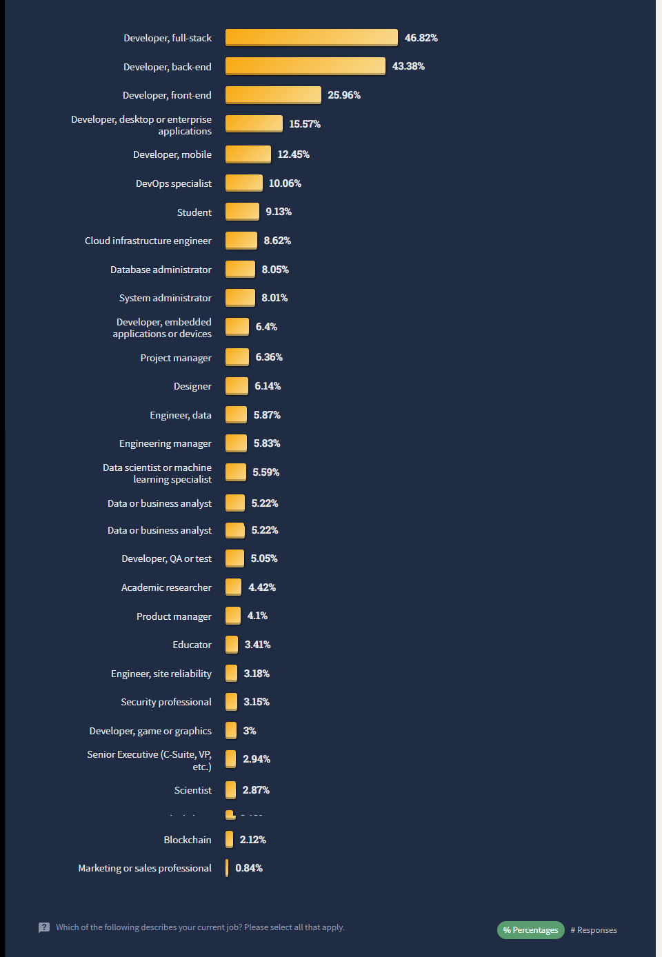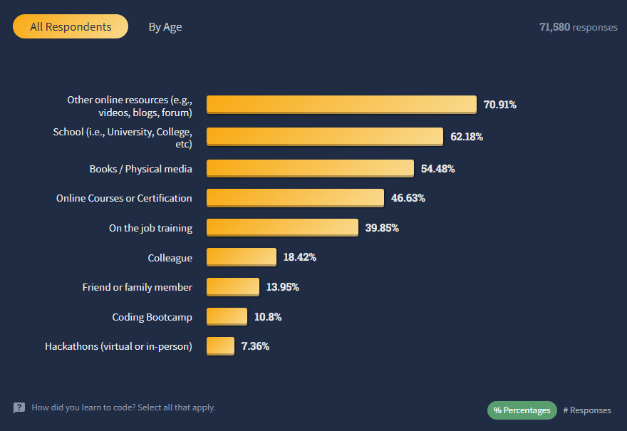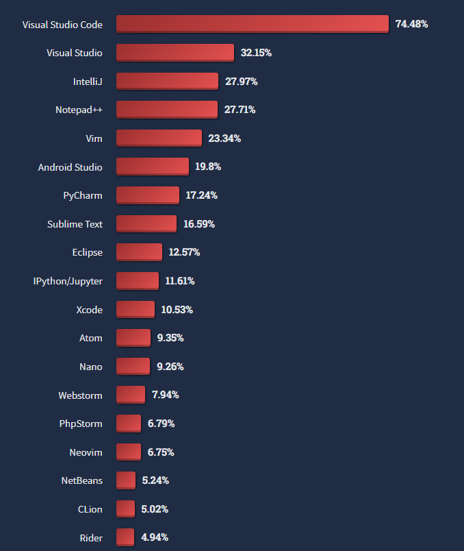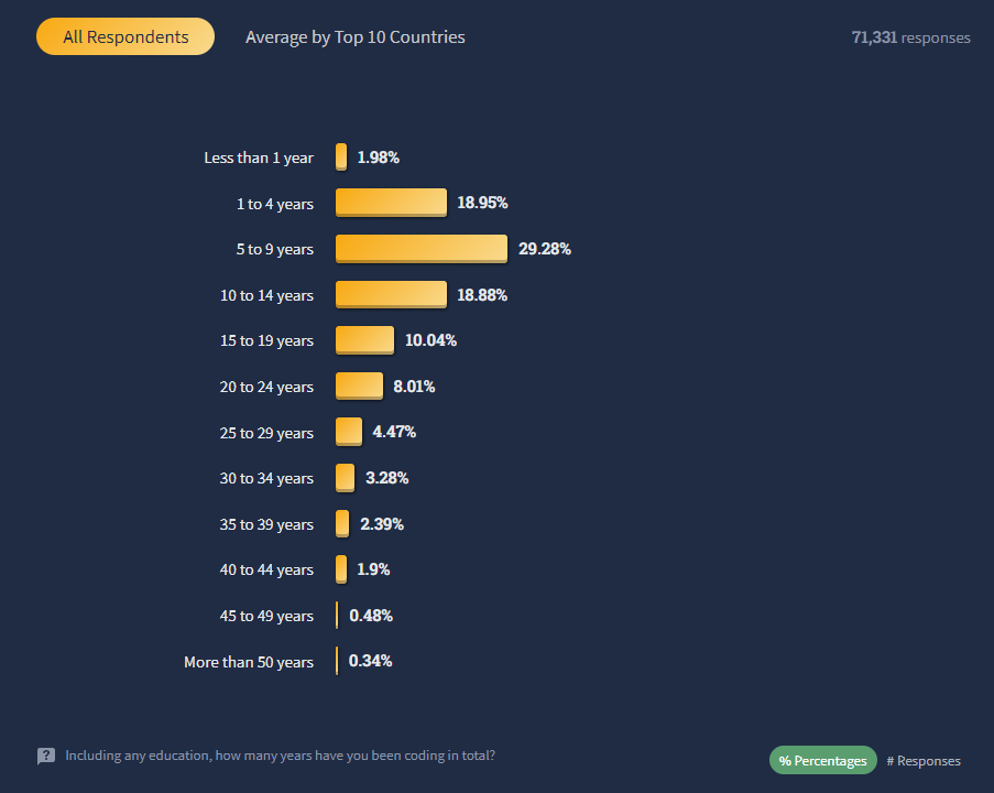 참고로 응답자들은 크게 Professional Developers(현업 종사자), Learning to Code(학생)으로 나뉘는데, professional의 비율이 77% 정도로 큰 비중을 차지한다. 아래의 응답 결과도 거의 professional들의 결과라고 보면 될듯.