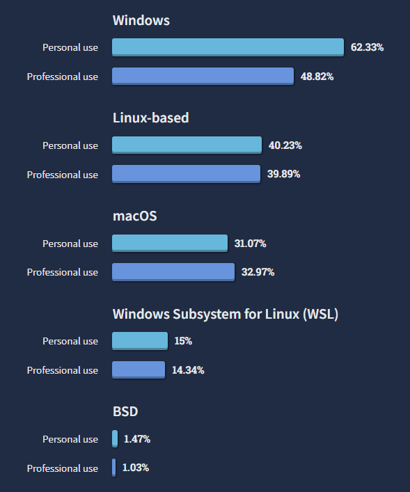Personal use는 개인적인 용도로, Professional use는 개발할 때 사용하는 비율을 말한다. 리눅스가 생각보다 높다?