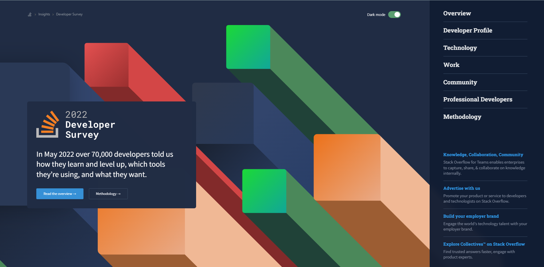 Stack Overflow에서 매년 개발자들의 동향을 조사하는 2022 Developer Survey의 결과가 발표되었다. 읽으면서 재밌는 결과 몇 개를 추려 보았다.