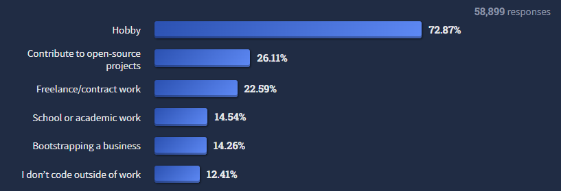 거의 73%가 취미로도 코딩한다고. 아예 안 하는 사람은 단 12% 뿐.