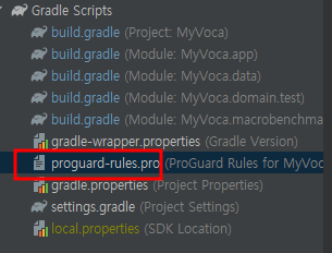 이제 알겠지? 이 파일에는 사용자 지정 ProGuard 규칙이 저장된다. 여기에서 ProGuard의 동작을 모듈별로 제어할 수 있다.