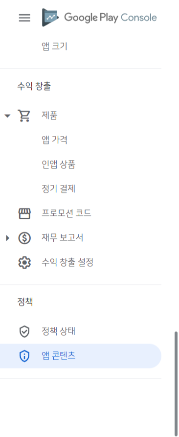 앱 콘텐츠 메뉴는 Play Console의 왼쪽 메뉴 맨 밑에 있다.