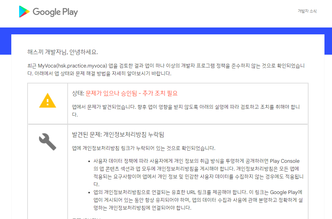 개인정보처리방침 항목이 제일 어려운데, 앱에서 민감한 데이터를 수집하는지 명시해야 하고, 수집한다면 데이터가 어떻게 저장되고 처리되는지, 안전한 HTTPS 연결을 사용하는지 등을 사용자에게 고지해야 한다.