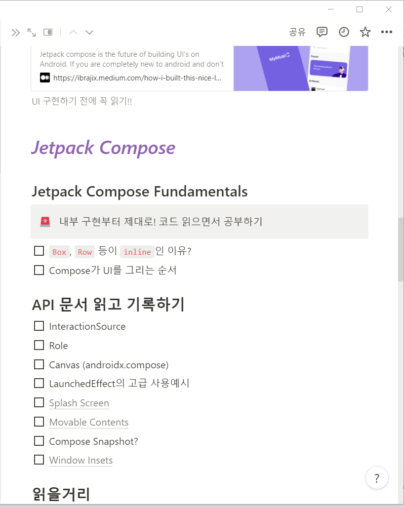 Notion에 공부해야 할 것들을 정리해 놓는데, 문서 양이 계속 우상향하고 있어서 걱정이다. 실력이 우상향해야 하는데.. 감사하게도 한 달간의 공부 시간을 얻었지만, 상황이 그리 녹록치 않다. 솔직히 막막하다.
