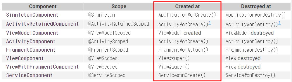 단, 해당 객체를 제공하는 모듈이 적절한 component에 존재해야 한다. 위의 코드에서 ``Foo`` 타입을 제공하는 바인딩은 ``SingletonComponent`` 또는 ``ActivityComponent``에 설치되어야 한다. 하위 component에 설치하면 Hilt가 바인딩을 못 찾는다.