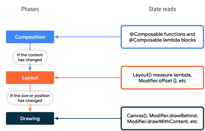 Compose는 composition의 결과에 따라 layout과 drawing 단계를 수행한다. 값이 바뀌었음에도 불구하고 레이아웃의 크기와 위치가 변하지 않은 경우엔 건너뛸 수도 있다.
