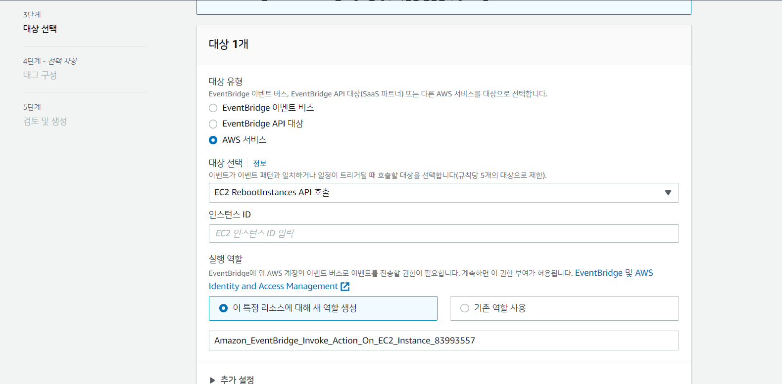 EC2를 재시작하기 위해 AWS 서비스에서 EC2 RebootInstances API 호출을 선택하고, 인스턴스 ID를 입력한다. 인스턴스 ID는 EC2 콘솔에서 확인할 수 있다.