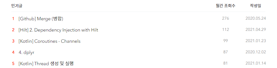 5위 Kotlin Thread 글도 마찬가지다. 코루틴의 비동기성 때문에 머리를 쥐어짠 적은 많아도, 명시적으로 스레드를 만들어 본 적은 없다. 대신 자바에서는 스레드를 많이 쓰니까 조회수가 잘 나오는 듯.