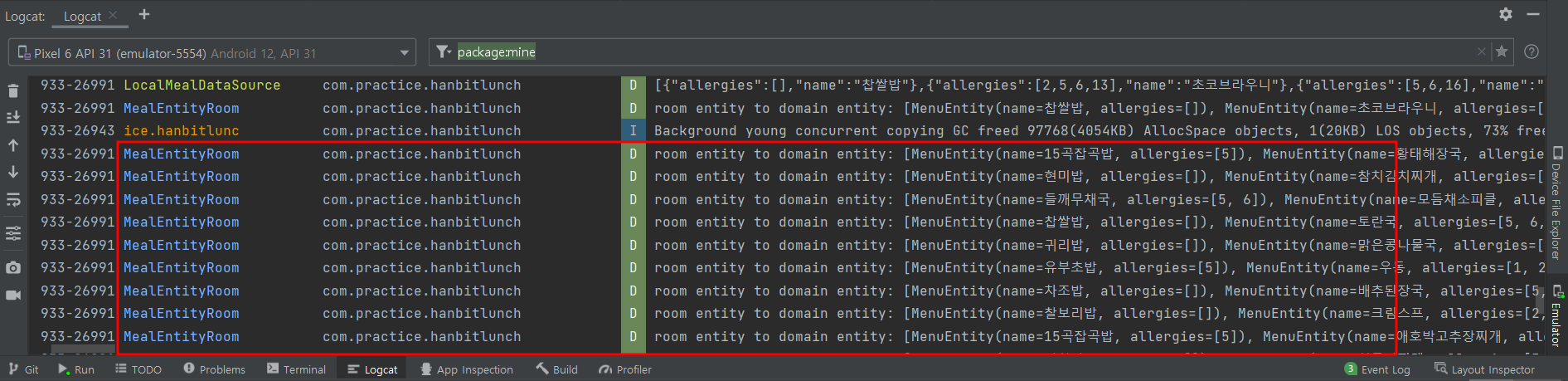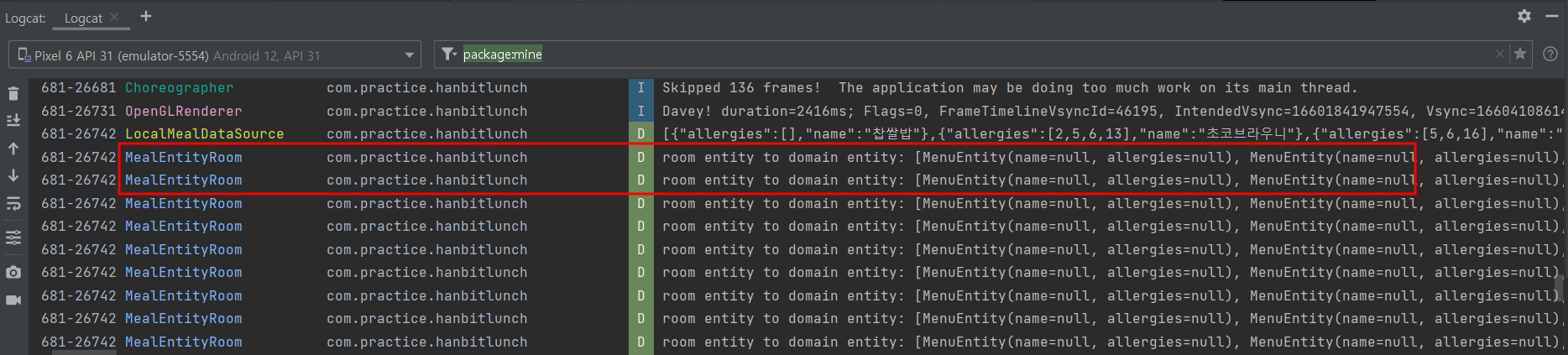 1시간 정도 고민한 결과 잘 모르겠다. 그래서 데이터가 전달되는 과정을 추적하기로 했다. ``Room``에 저장된 식단 정보는 ``DataSource``, ``Repository``, ``UseCase``, ``ViewModel``을 거쳐 UI에 전달되는데, 어딘가에서 null로 바뀌었을 가능성이 높다.