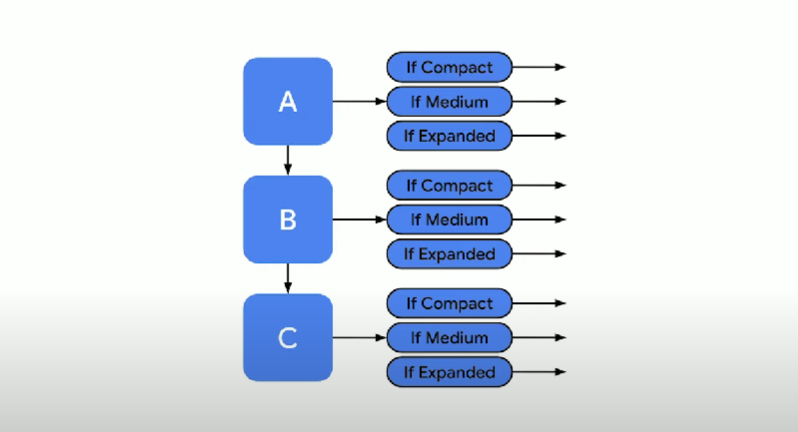 아래 그림처럼 화면 크기에 따라 서로 다른 navigation 구조를 만드는 방법은 추천되지 않는다. 반응형 UI에서는 화면의 크기가 언제든지 바뀔 수 있음을 전제하는데, 화면 크기에 따라 navigation을 분리하면 너비가 바뀔 때마다 navigation graph를 옮겨가야 한다. 틀림없이 매우 귀찮고 복잡한 작업이다. 으악!