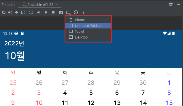 Android Studio Dolphin 버전에서 추가된 Resizable(Experimental) 에뮬레이터를 이용하면 하나의 기기에서 다양한 크기의 화면을 시뮬레이션할 수 있다.
