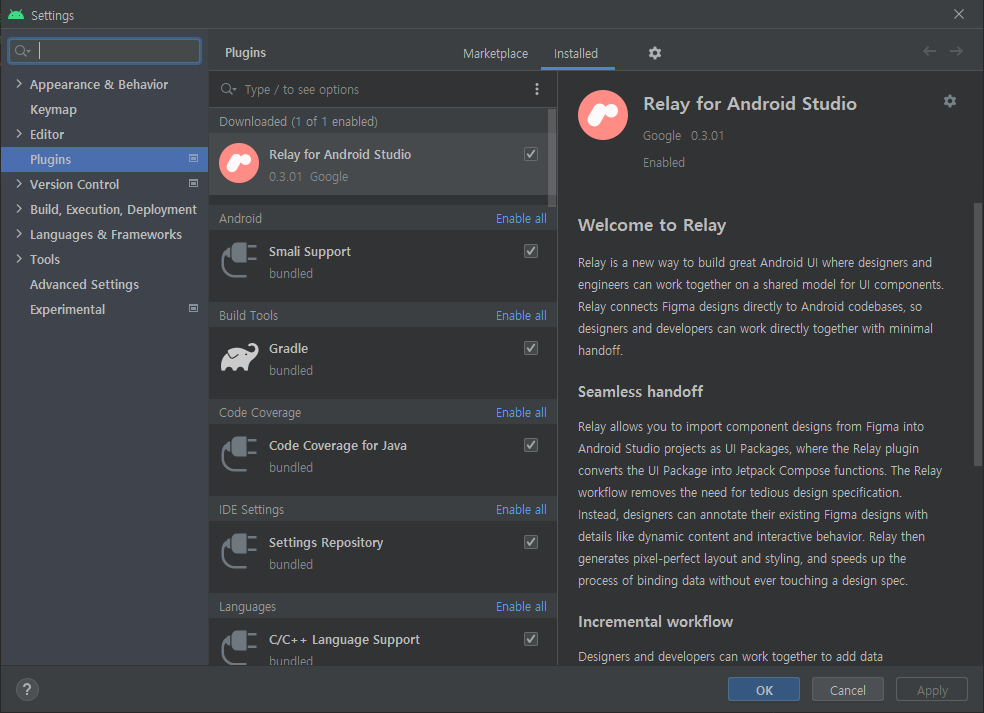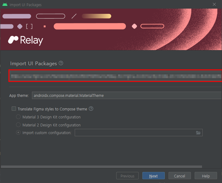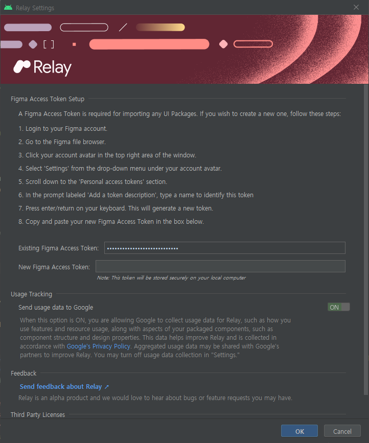 Android Studio에서 ``Relay for Android Studio`` 플러그인을 설치한 후, Tools - Relay settings에서 Figma Access Token을 추가하자. 시키는 대로 하면 된다.