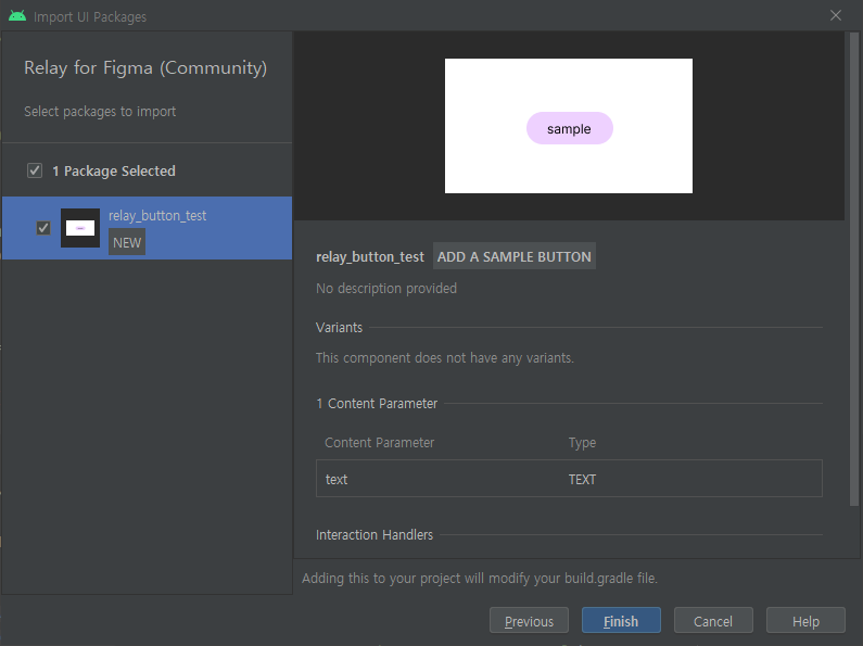 Next를 누르고 잠시 기다리면 가져올 UI의 정보를 볼 수 있다. Finish를 눌러 UI를 추가하자.