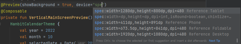 ``@Preview`` 어노테이션에 프리뷰를 보여줄 기기 정보를 설정할 수 있다. 그런데 무려 기기 스펙을 문자열로 명시하는 문법이다;;
