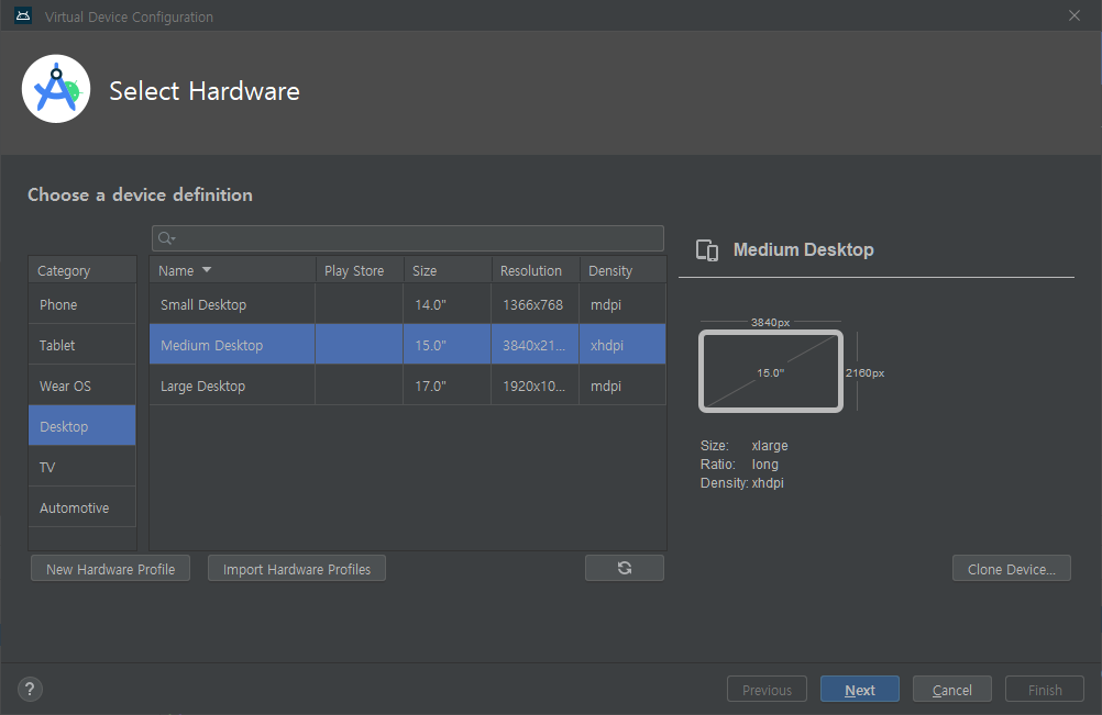 설치 방법은 간단하다. 에뮬레이터 추가 화면에서 Desktop을 선택하면 끝이다.