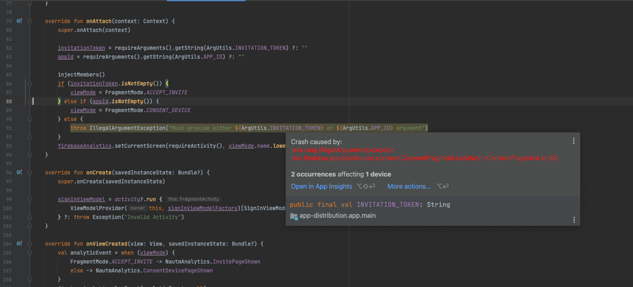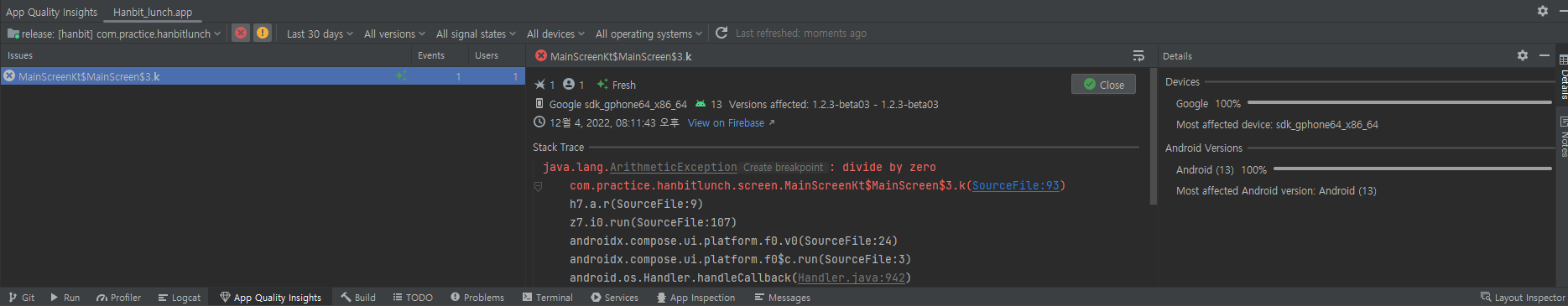 Firebase에서 제공하는 crash 추적 기능인 Crashlytics를 Android Studio에 연결할 수 있다. Crash의 stack trace를 Android Studio에서 볼 수 있다.