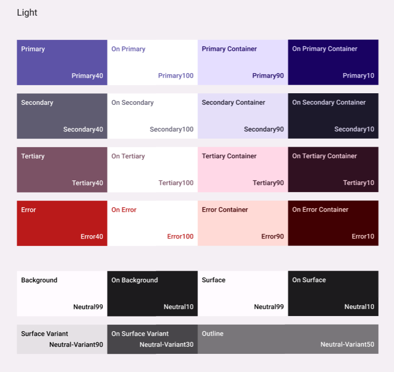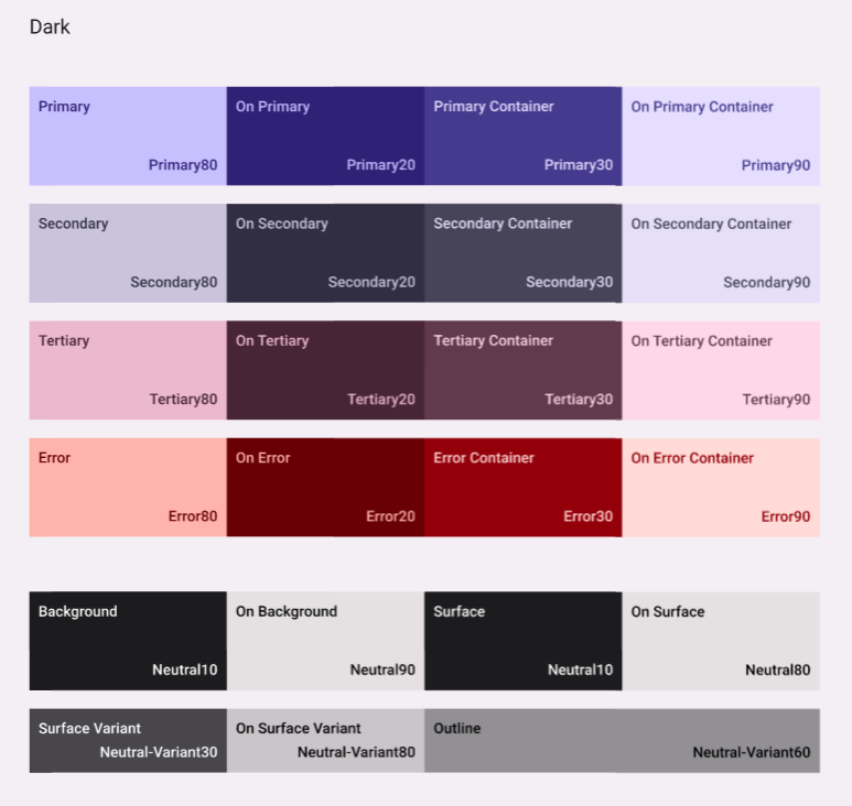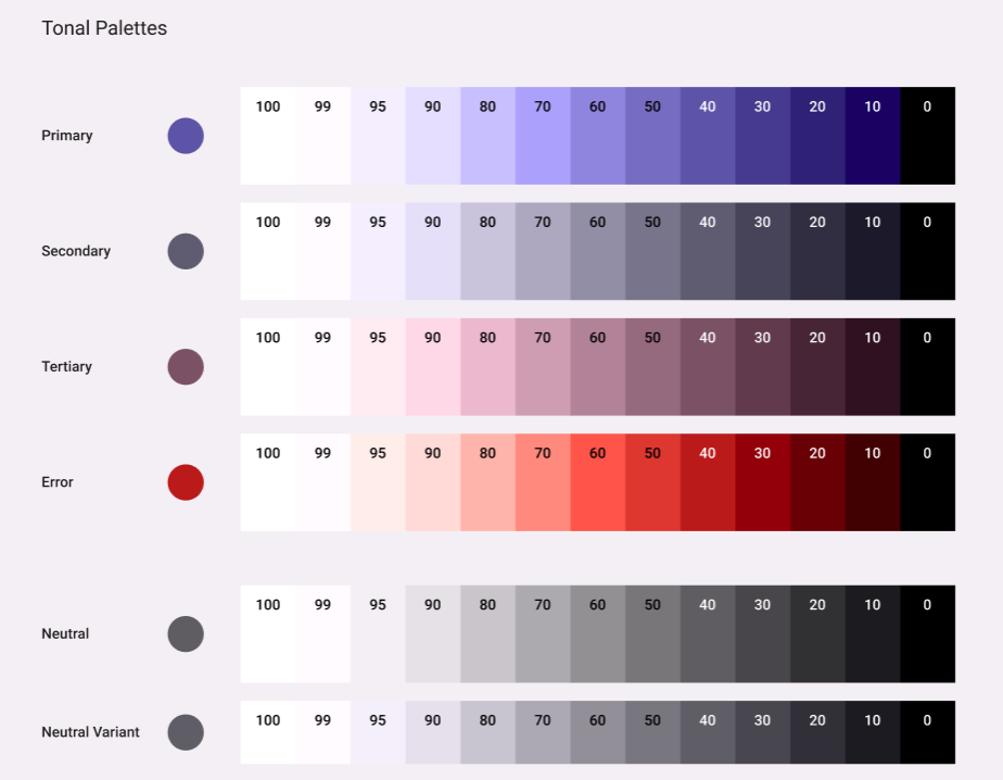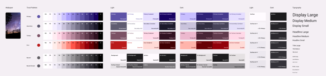맨 왼쪽의 Tonal Palette는 사진에서 추출한 3개의 색에 명도 값을 다르게 하여 생성한 팔레트이다. Material 2에서 PrimaryVariant와 SecondaryVariant가 사라진 대신 Tertiary가 추가되었다.