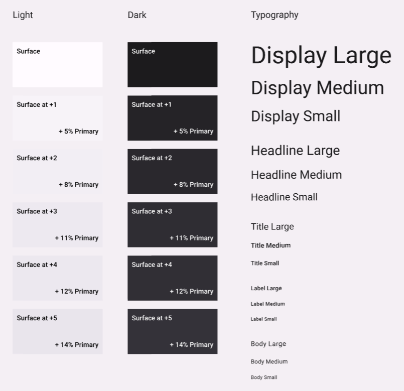 마지막으로 원근감을 위한 Surface 색과 Typography 스타일이 주어진다.