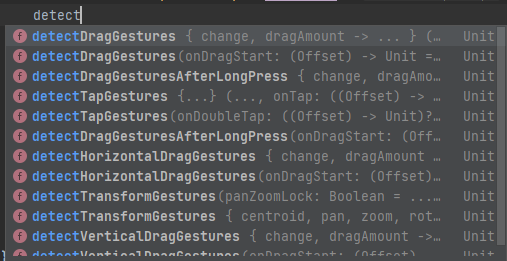 ``detect...`` 함수를 사용하면 Tap, Drag, Transform 제스쳐를 개별적으로 추적할 수 있다. 함수 목록은 다음과 같다. Transform 제스쳐는 확대, 축소, 회전 제스쳐를 의미한다.