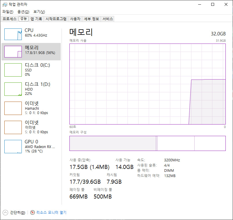 캬 32기가~ 안드로이드 스튜디오를 2개나 띄워도 절반이나 남은 모습 ㅎㅎ