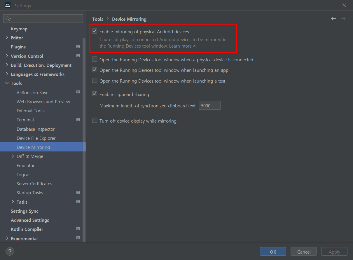 File - Settings - Tools - Device Mirroring 메뉴의 Enable mirroring of physical Android devices 항목을 체크하면 된다.