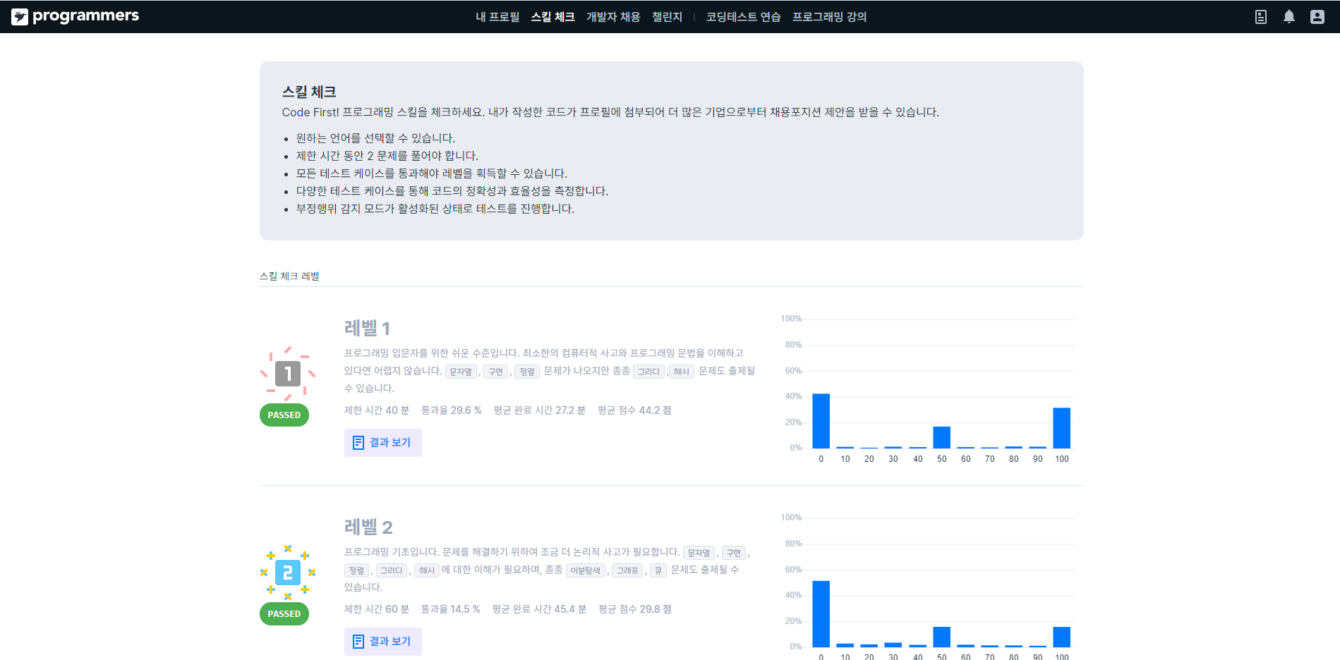 내 코딩 실력을 대략적으로 테스트해 볼 수 있는 페이지다. 레벨 1부터 5까지 준비되어 있다. 제한 시간 안에 주어지는 문제를 해결해야 하는데, 정답을 직접 출력하는 게 아니라 반환하기만 하면 된다. 즉, 어떤 문제를 풀어서 정답을 돌려주는 함수를 작성하면 된다(정확히는 주어지는 함수 템플릿을 완성하면 된다). 전역 변수와 함수는 자유롭게 사용할 수 있다. 말이 조금 어려운데, 해 보면 알 거다.