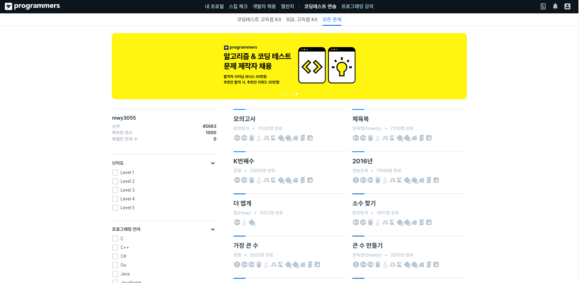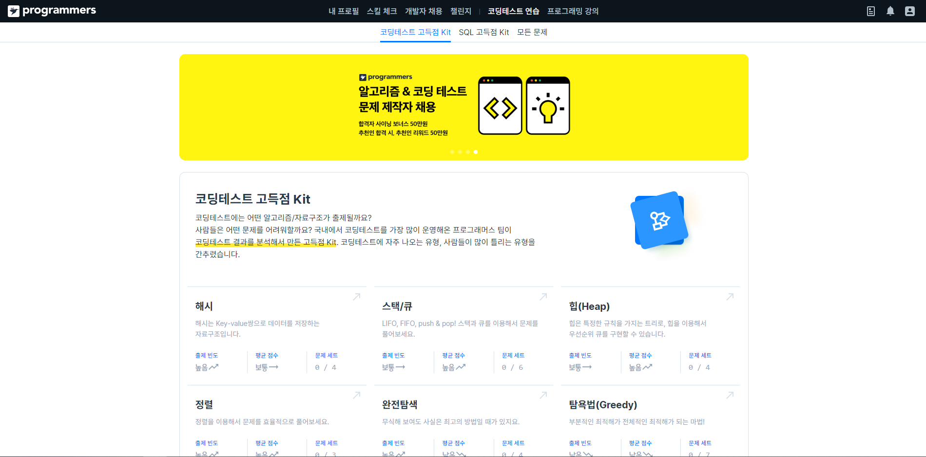 메뉴에 SQL 고득점 Kit도 있긴 한데, DB 관련 직종으로 취업할 사람들에게는 좋을 듯 하다. 난 아직 DB에 관심이 없어서..