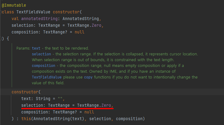 그런데 ``TextFieldValue``의 생성자를 보면, 커서의 위치를 나타내는 ``selection``의 기본값이 ``TextRange.Zero``이다. 즉 명시적으로 값을 넘겨주지 않는 이상, 커서는 언제나 맨 앞에 위치한다는 것.