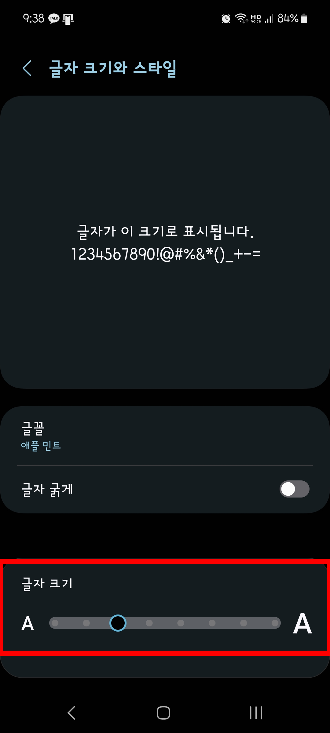 시스템 설정의 ``글자 크기`` 항목이 바로 이 fontScale을 설정하는 것이다. UI에서 설정한 ``sp`` 값에 fontScale을 곱하면 실제로 UI에 보일 글씨 크기를 얻을 수 있다. 기본값은 1.0이고, 최댓값은 2.0이다.