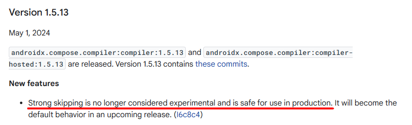 Compose 컴파일러 1.5.13 버전에서 Strong skip 모드가 stable로 전환됐다. 곧 default 설정으로 바뀔 예정.