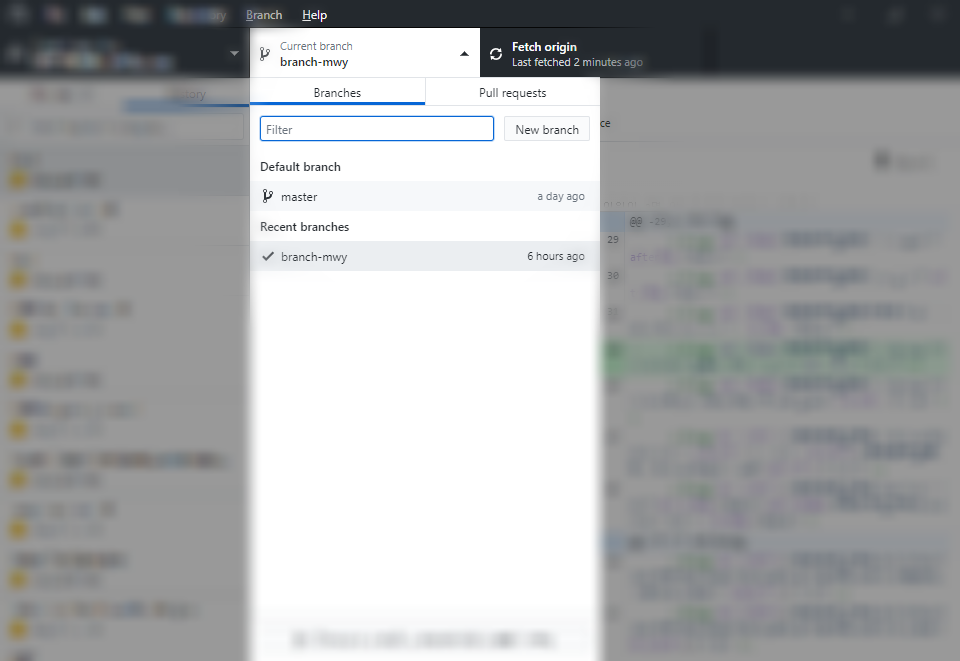 Github desktop에서 병합해 봅시다. 여기서는 제가 이전 글에서 만든 브랜치 branch-mwy에서 master로 병합해 보겠습니다.