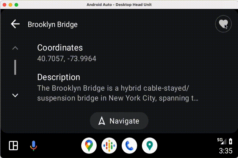 이제 장소별 상세 정보를 보여주는 화면을 추가해 보자. 지도에 표시된 마커를 터치했을 때 상세 정보가 보이고, 해당 위치로 안내할 지 확인하는 화면을 구현할 것이다. 최대 4개의 텍스트를 보여줄 수 있는 ``PaneTemplate``를 활용하면 된다.