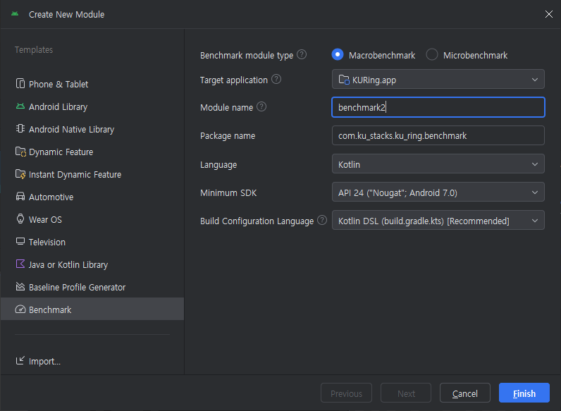 먼저 Macrobenchmark 모듈을 만들어야 한다. Android Studio에서 제공하는 템플릿을 사용하면 매우 쉽게 만들 수 있다.