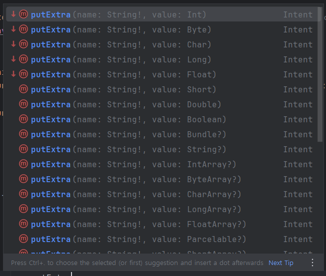 Activity는 ``Intent``를 통해 시작할 수 있다. 이때 ``Intent.putExtra()``를 활용하면 activity에 데이터를 보낼 수 있다.