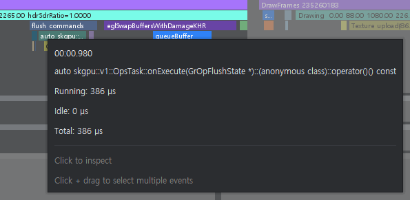 - 그런데 ``Chronographer#doFrame()``이 종료된 후 렌더 스레드 작업이 즉시 실행되지 않는다. 렌더 스레드가 다른 작업으로 포화되었기 때문이다.