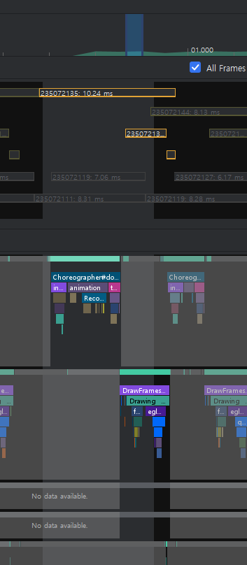 - Profiler를 자세히 보니, ``Choreographer#doFrame()``은 비교적 빨리 끝난다. (약 2ms 정도)