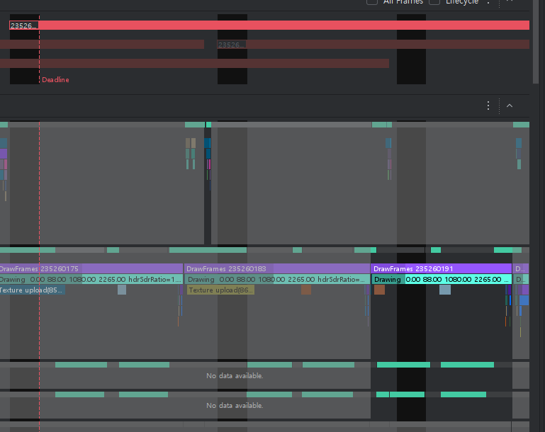 Actual Timeline These slices represent the actual time an app took to complete the frame (including GPU work) and send it to SurfaceFlinger for composition. The start time is the time that Choreographer#doFrame or AChoreographer_vsyncCallback started to ru