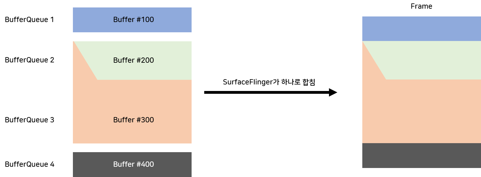 각 surface는 buffer queue를 통해 SurfaceFlinger에 전달된다. SurfaceFlinger는 각 buffer queue의 최신 surface만을 사용하여 프레임을 만든다.