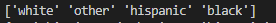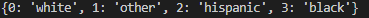 print(np.array(dict(enumerate(df.race.unique())))) # index each unique values
